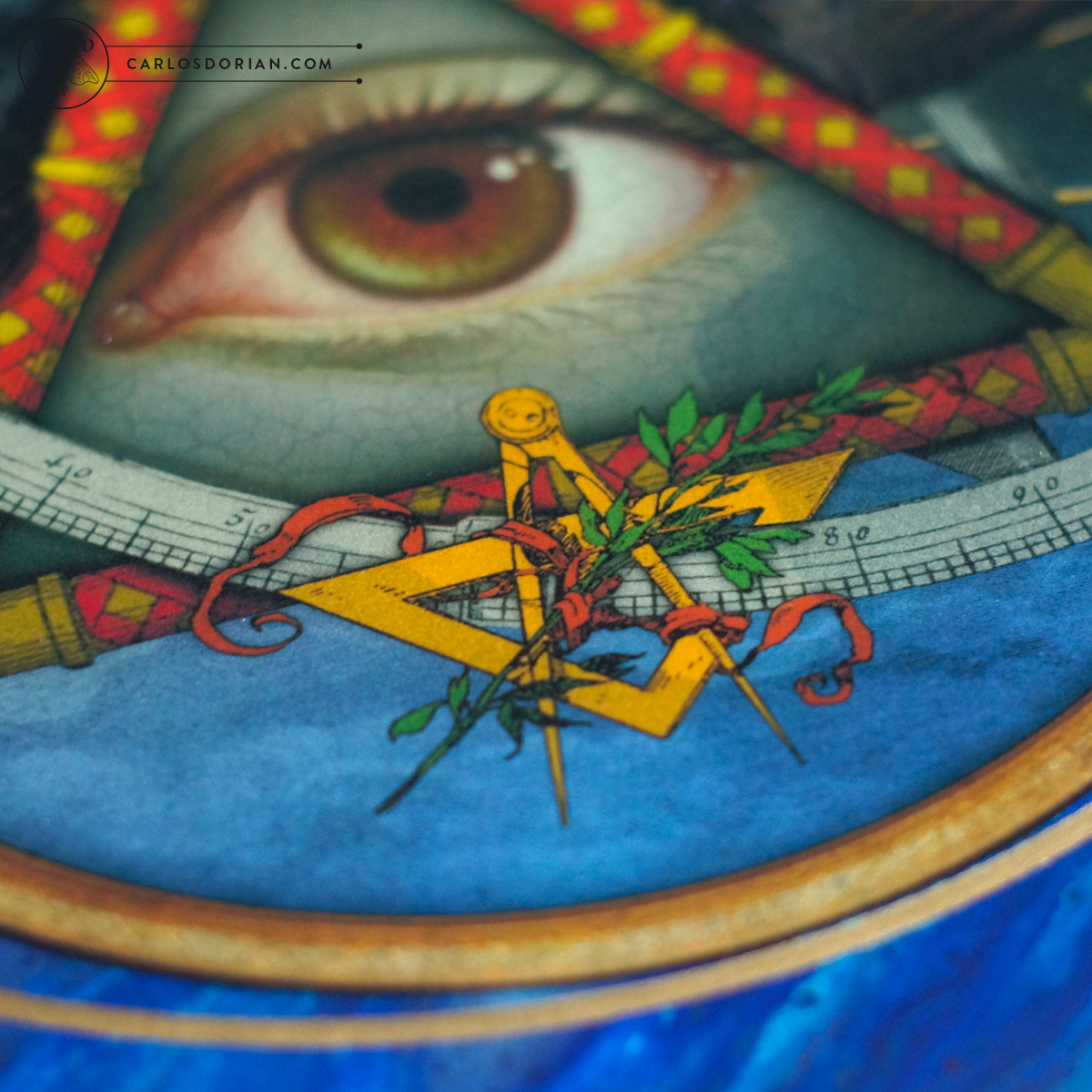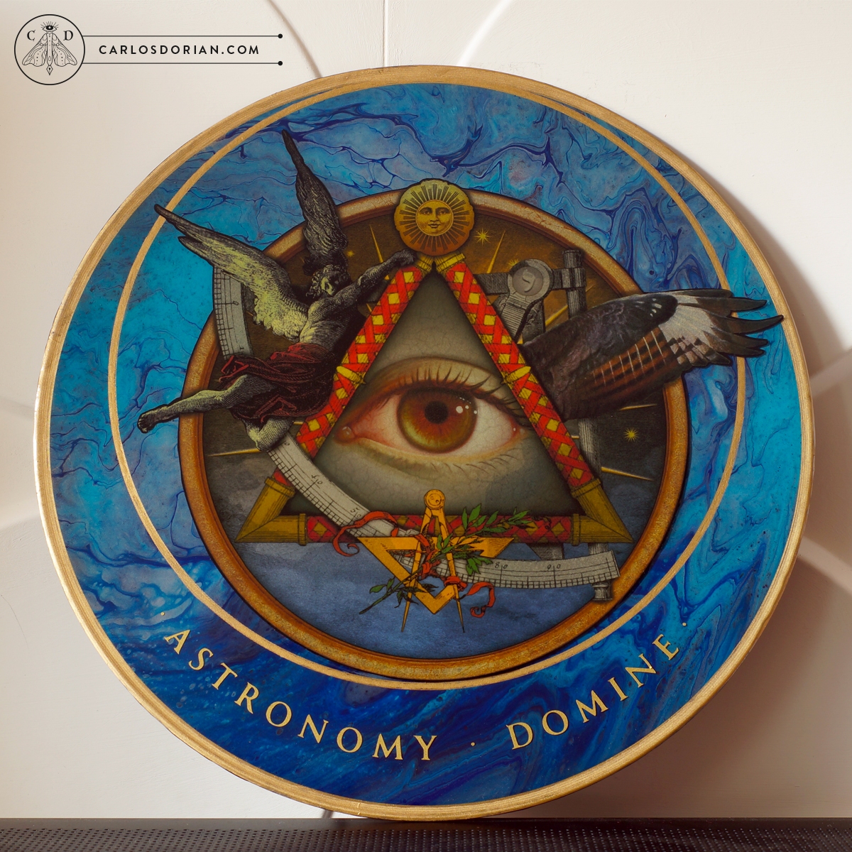 This collage was made using analog and digital techniques, printed on high quality archival paper and paste on a beautiful “acrylic fluid painting” background with gilded strokes. I used as support a 12” vinyl record (a wonderful support, rigid and durable). The painting was finished with several coats of cristal-like resin with UV protection that gives a beautiful shine and more life to the colors.