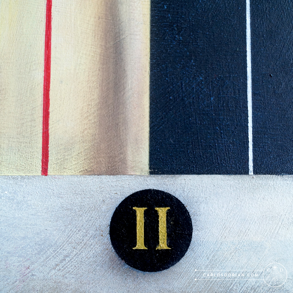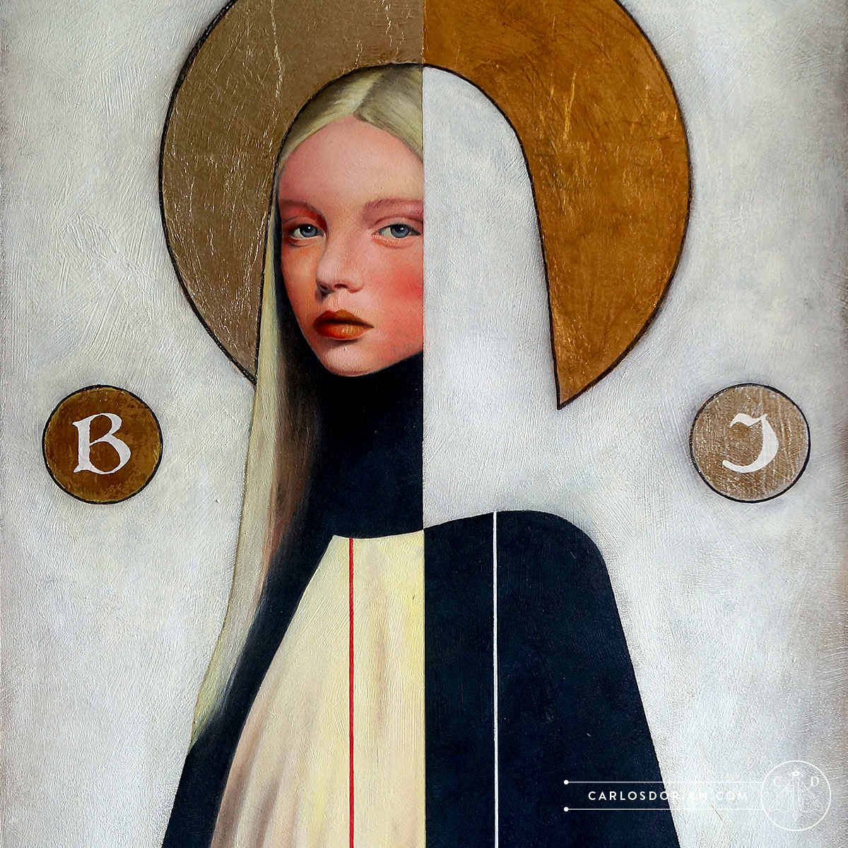 In this painting, duality becomes tangible through the contrast between gold and silver, and between black and white, playing with positive and negative space. The composition blends the solemnity and detail of classical portraiture with geometric blocks that introduce a modern, abstract rhythm. The strong emphasis on verticality and the interaction of forms reinforce the concept of balance between opposites, allowing the work not only to be seen but to be experienced as a reflection of the harmony that sustains the universe.