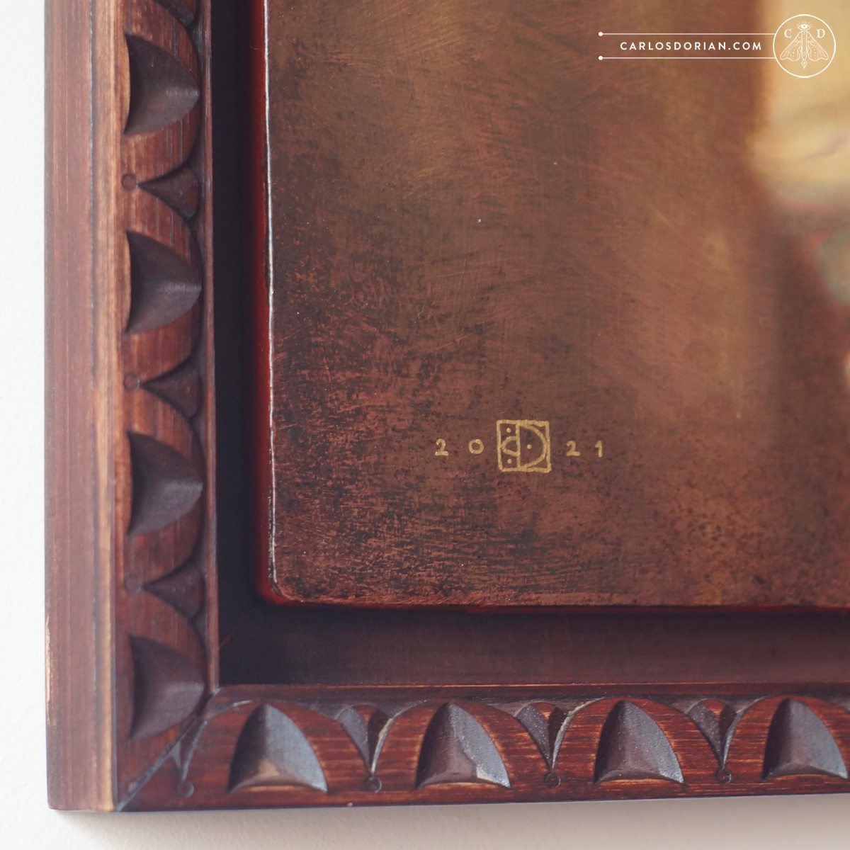 Features: Background wood debossed and covered on aged silver foil. Painting with limited color palette on sienna tones. Finished with protective matt varnish.