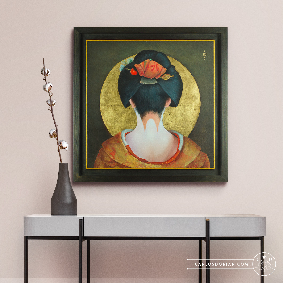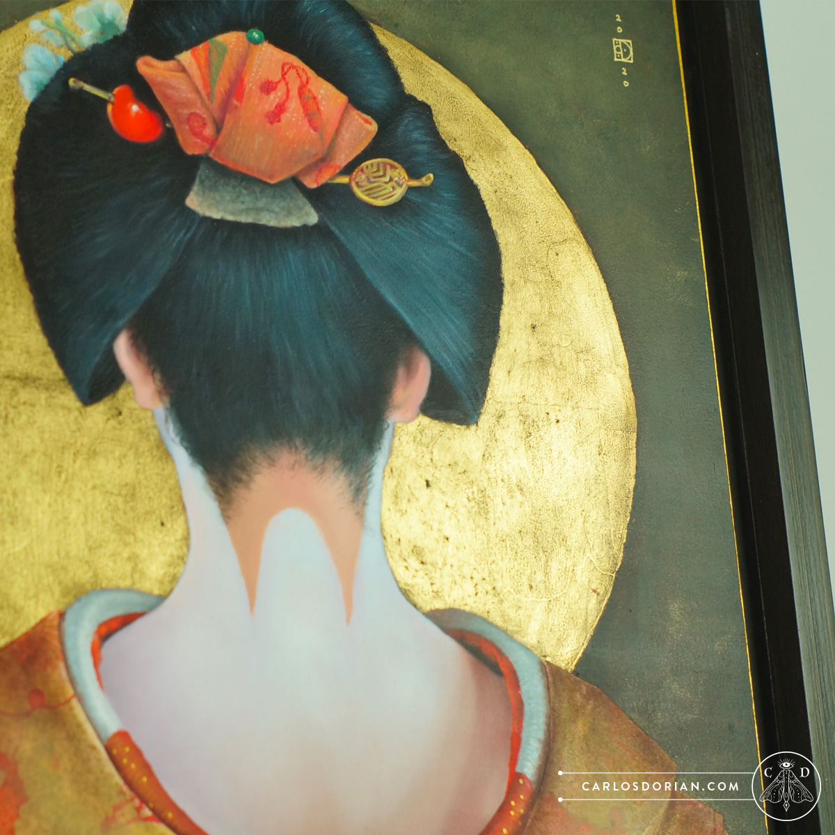 Oil painting from a young Maiko. “Yuugure” it’s a summer dance made by a Maiko or a Geisha with the help of a fan or an uchiwa. It’s about the summer twilight and the sun rising over the river Kamogawa.