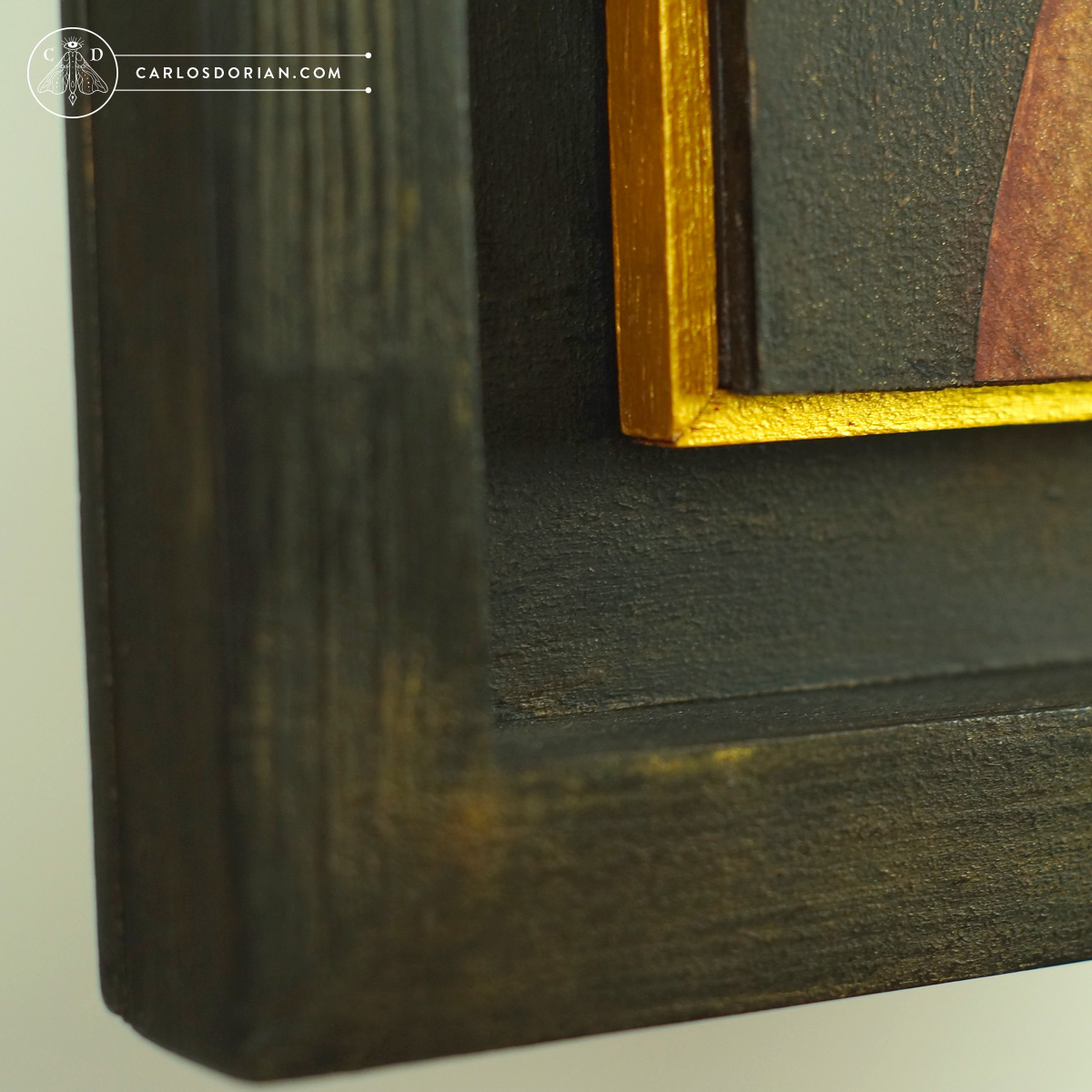 Frame: Box Frame handmade in wood and painted in aged dark brown, black and gold by the artist. Dimensions: 61,5 x 61,5 cm approximately.