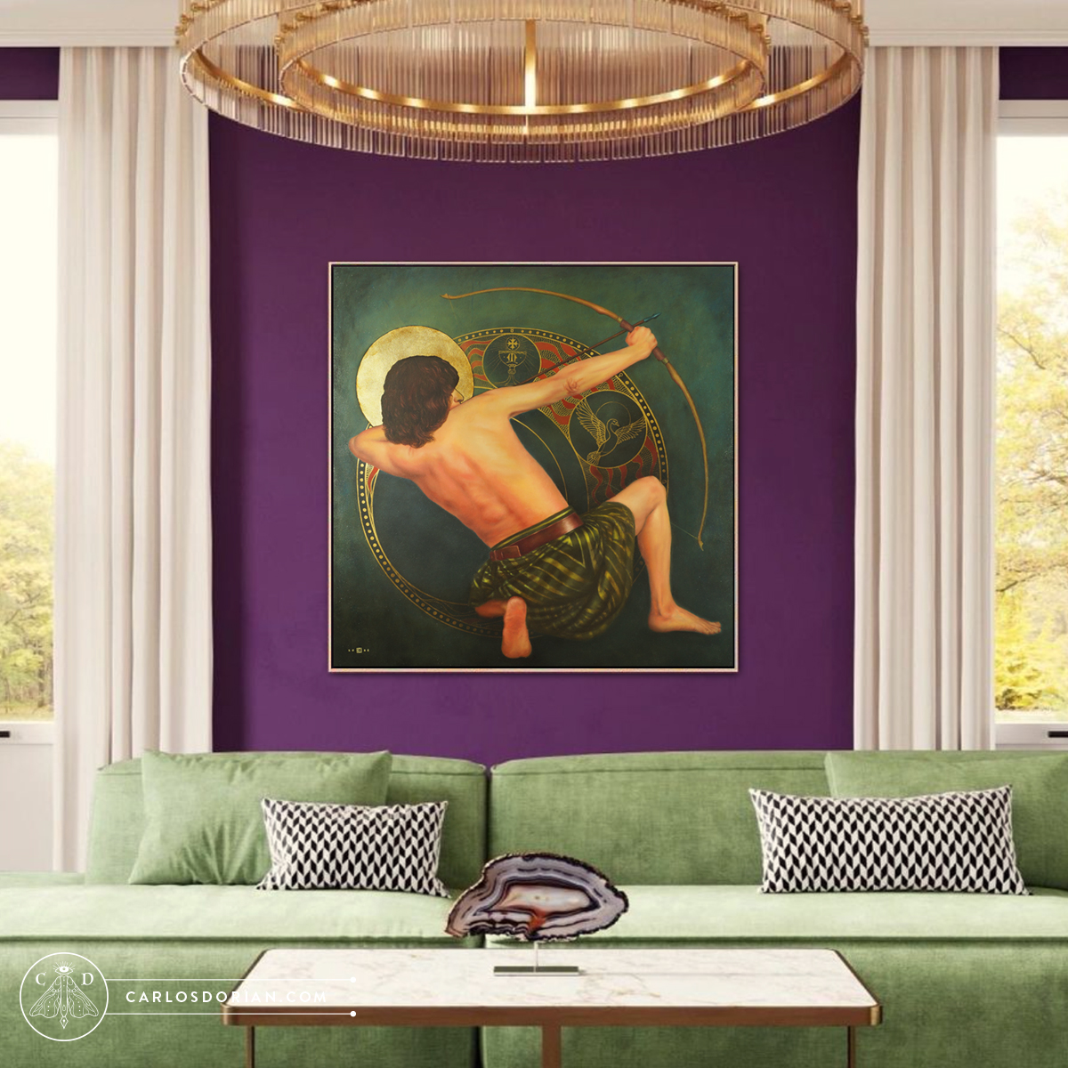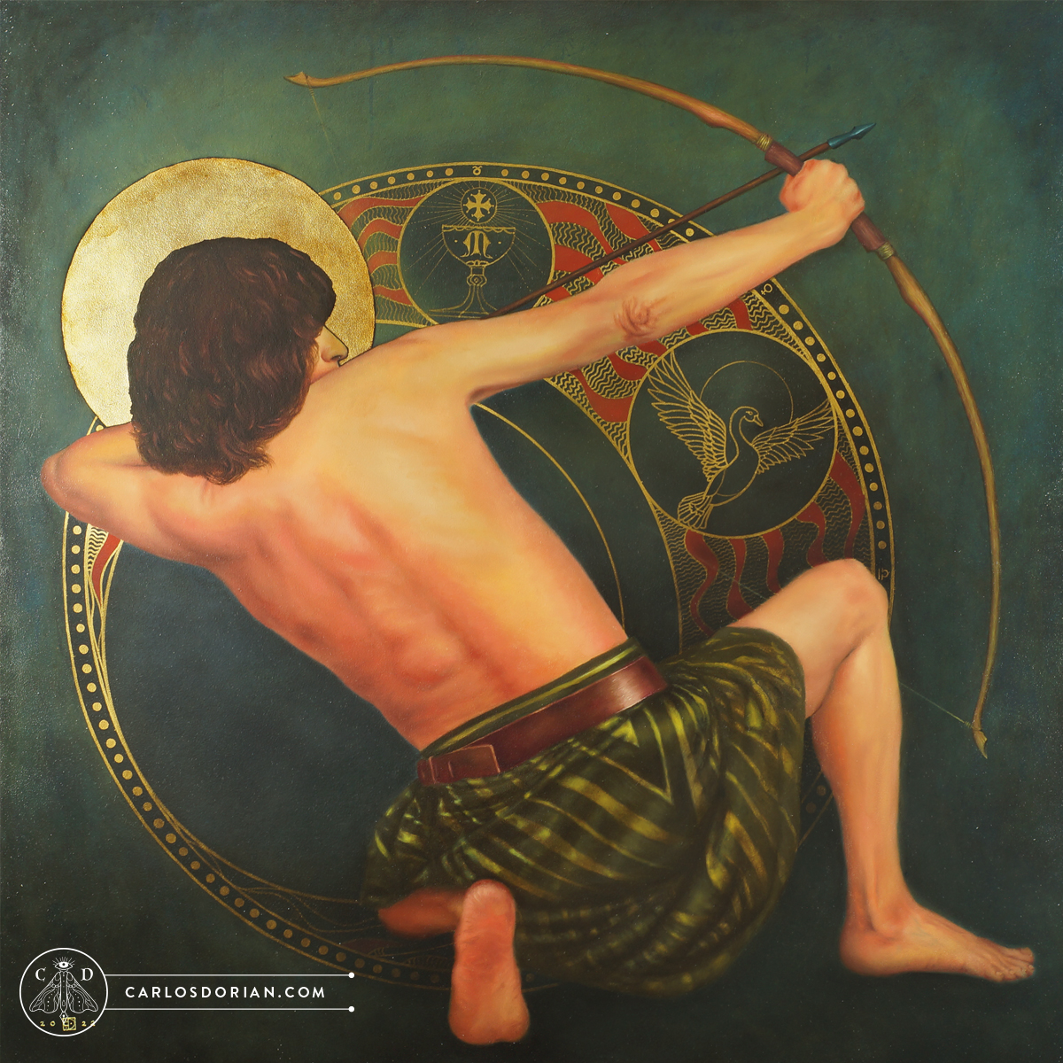 This oil painting shows the legendary character Parsifal in all its purity. The archer stands as a hero, standing out against a dark and ornamental background that plays with lights and shadows to highlight his figure. The painting captures the essence of Parsifal with an intense and concentrated expression at the moment he is going to shoot the Swan in the sacred surroundings of Montsalvat. The rich color palette, with earthy and warm tones, adds depth to the composition, creating an epic atmosphere.