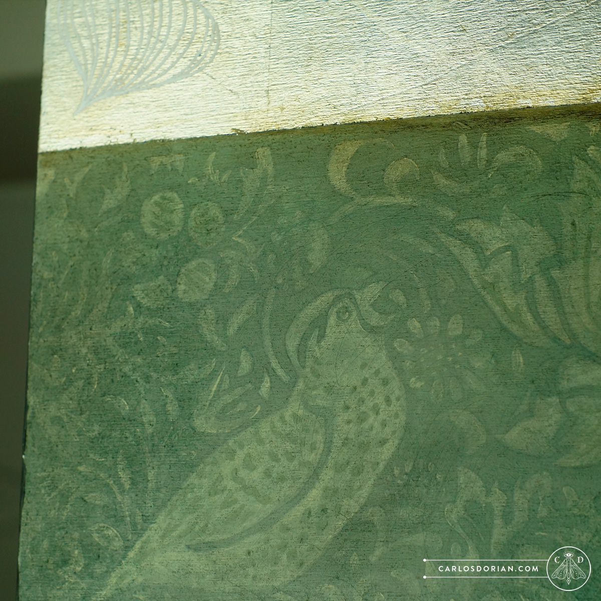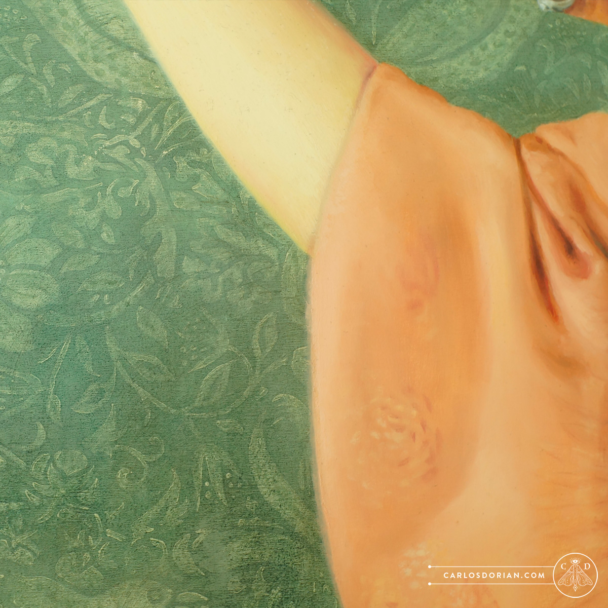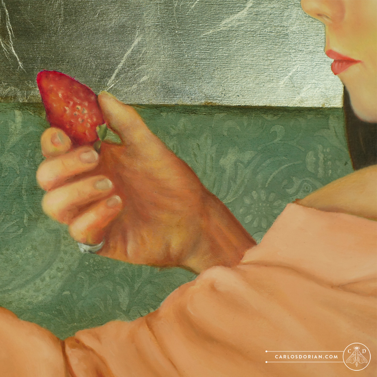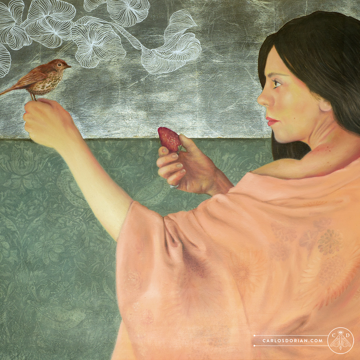 This portrait have some influences from Japonisme, Medieval or Pre-Raphaelite paintings, it takes its subject and title from a famous design by British Artist William Morris. “Strawberry Thief” is the most popular pattern design for textiles of Morris, made around 1883. It takes as its subject the thrushes that Morris found stealing fruit in his kitchen garden of his countryside home, Kelmscott Manor, in Oxfordshire.