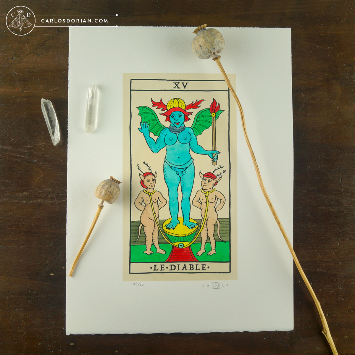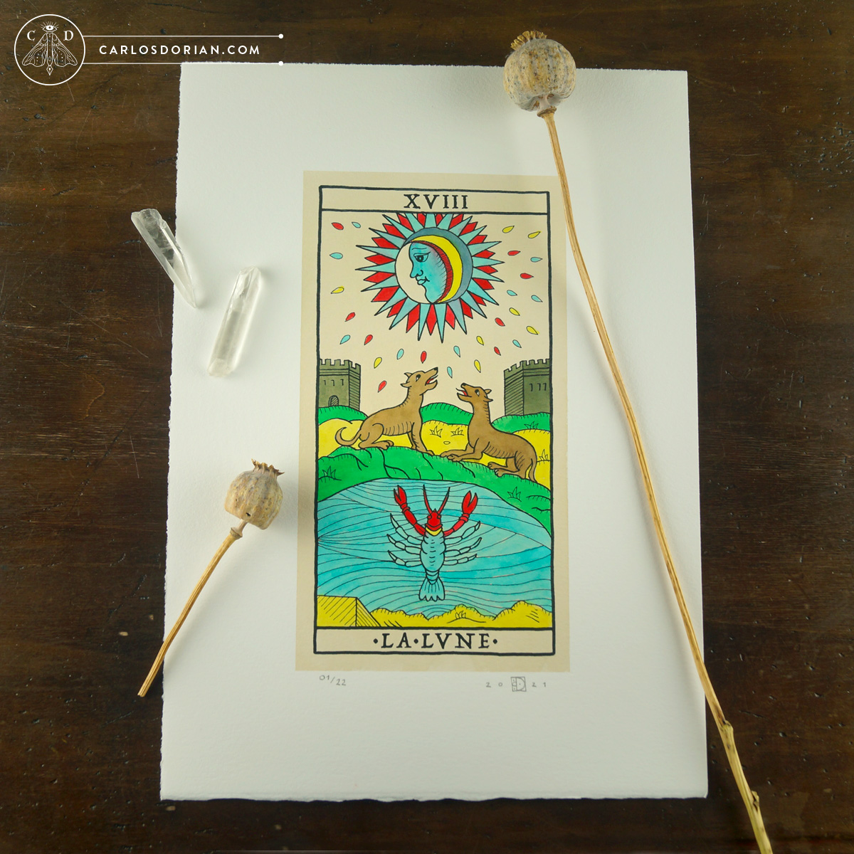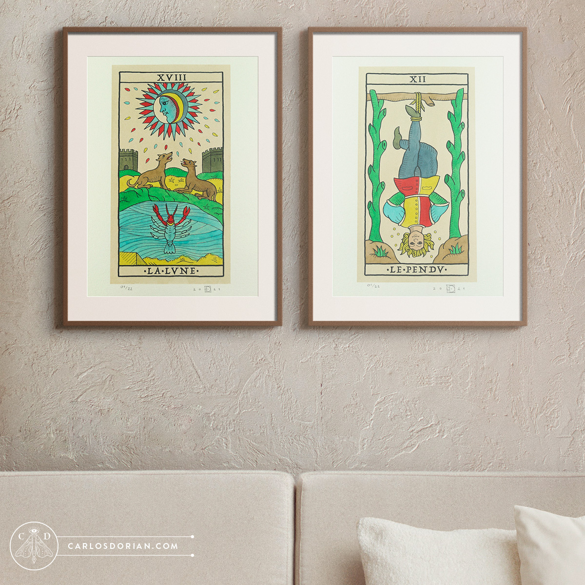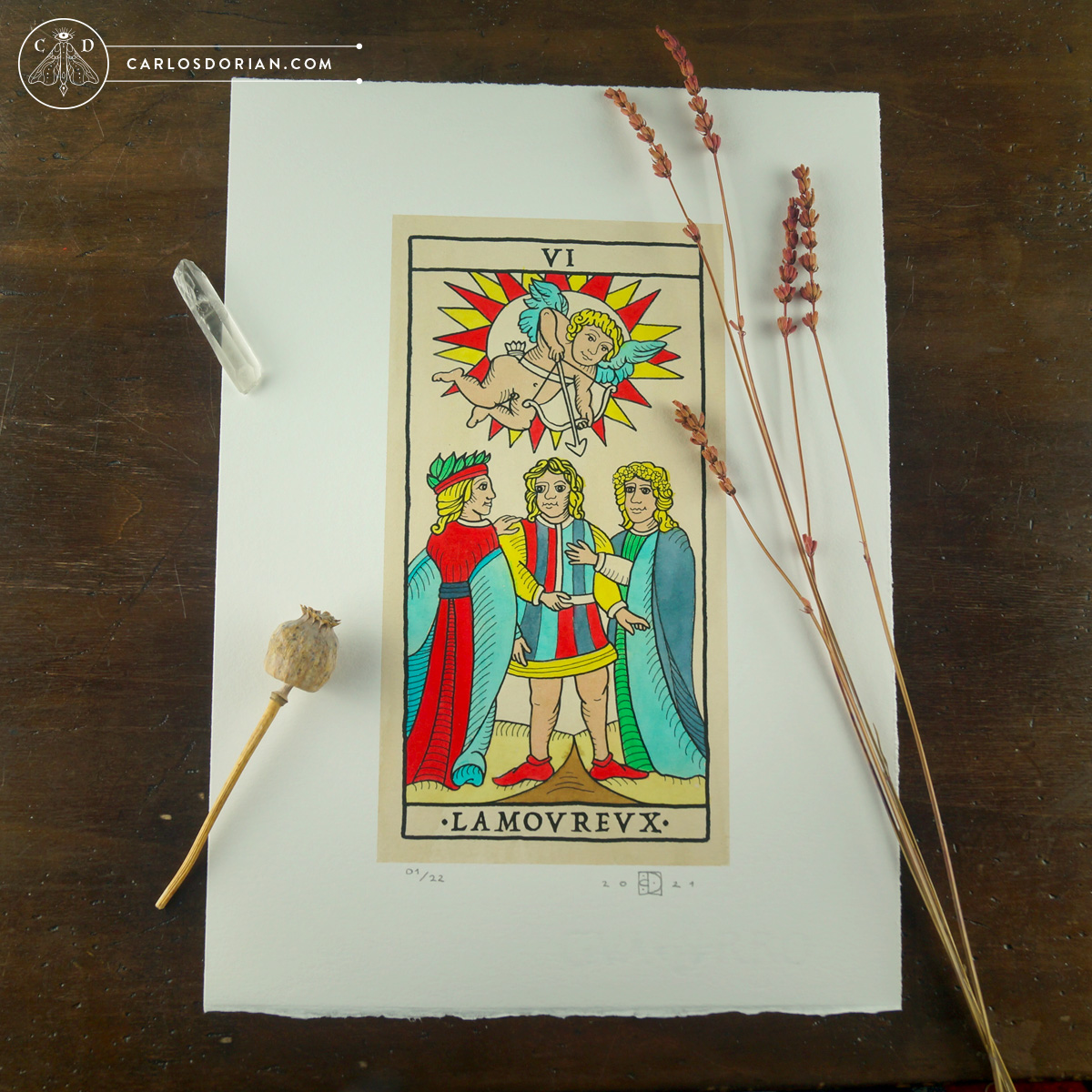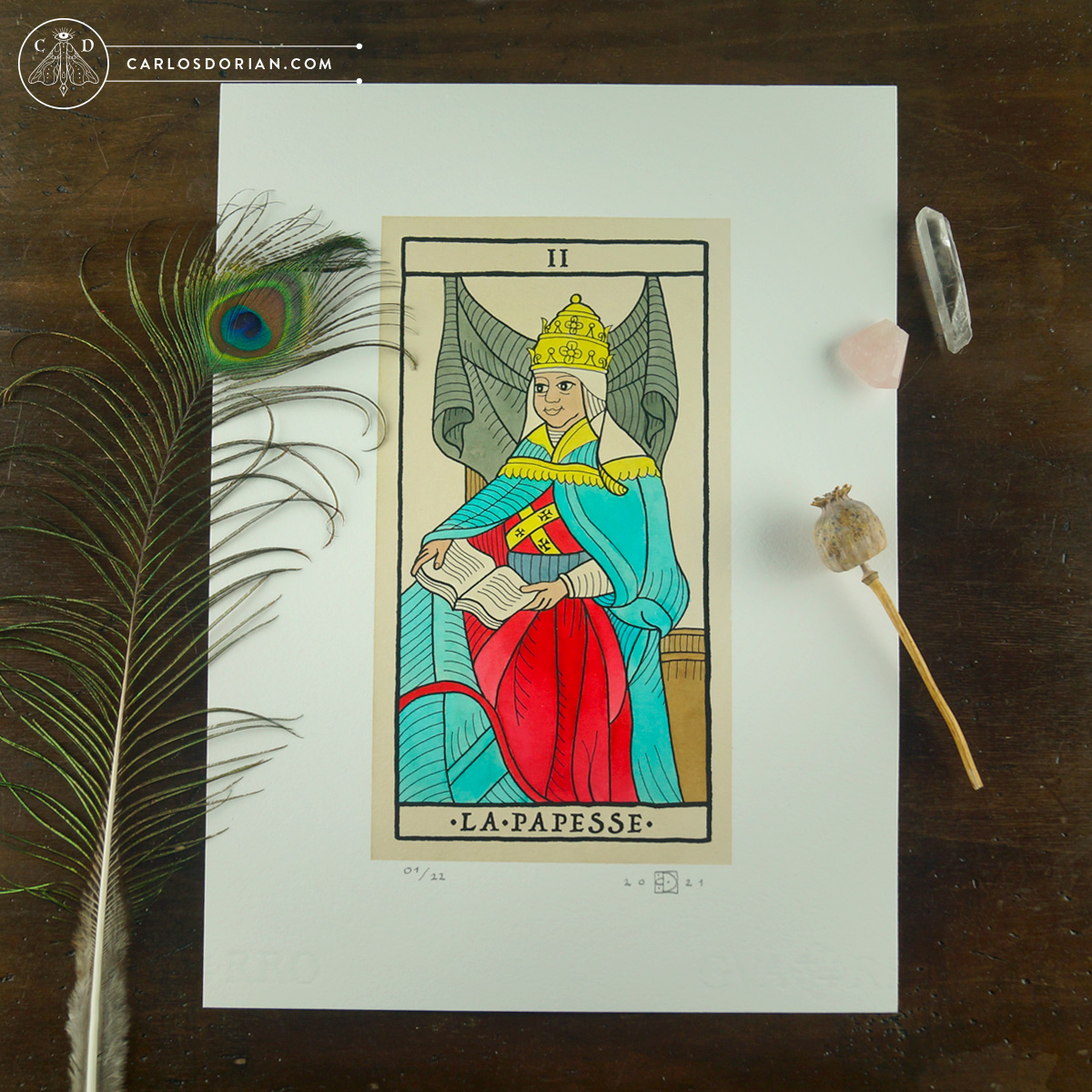Drawings of the Major Arcana that make up the “Ludus Triumphorum” deck. These Tarot Watercolor sheets are printed in black ink on high quality cotton paper and hand colored one by one.