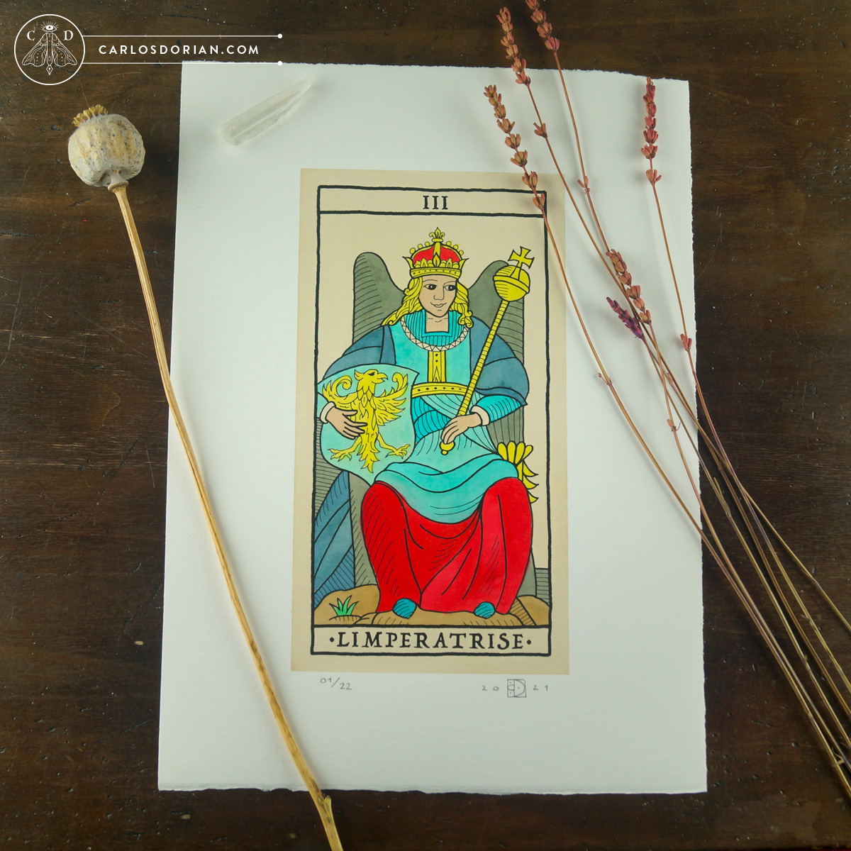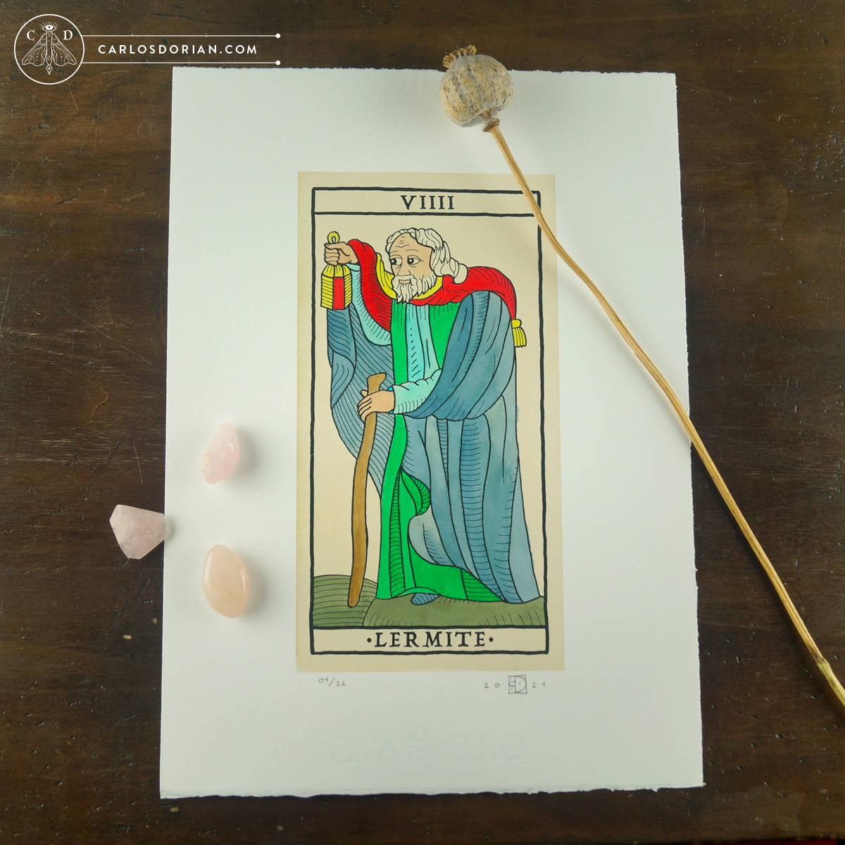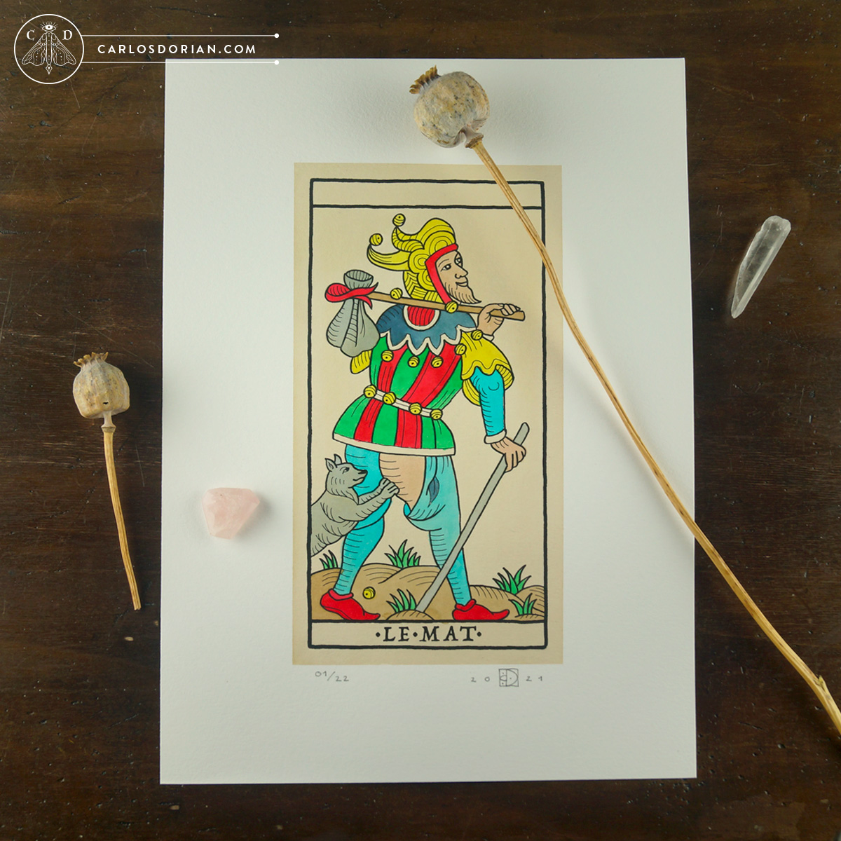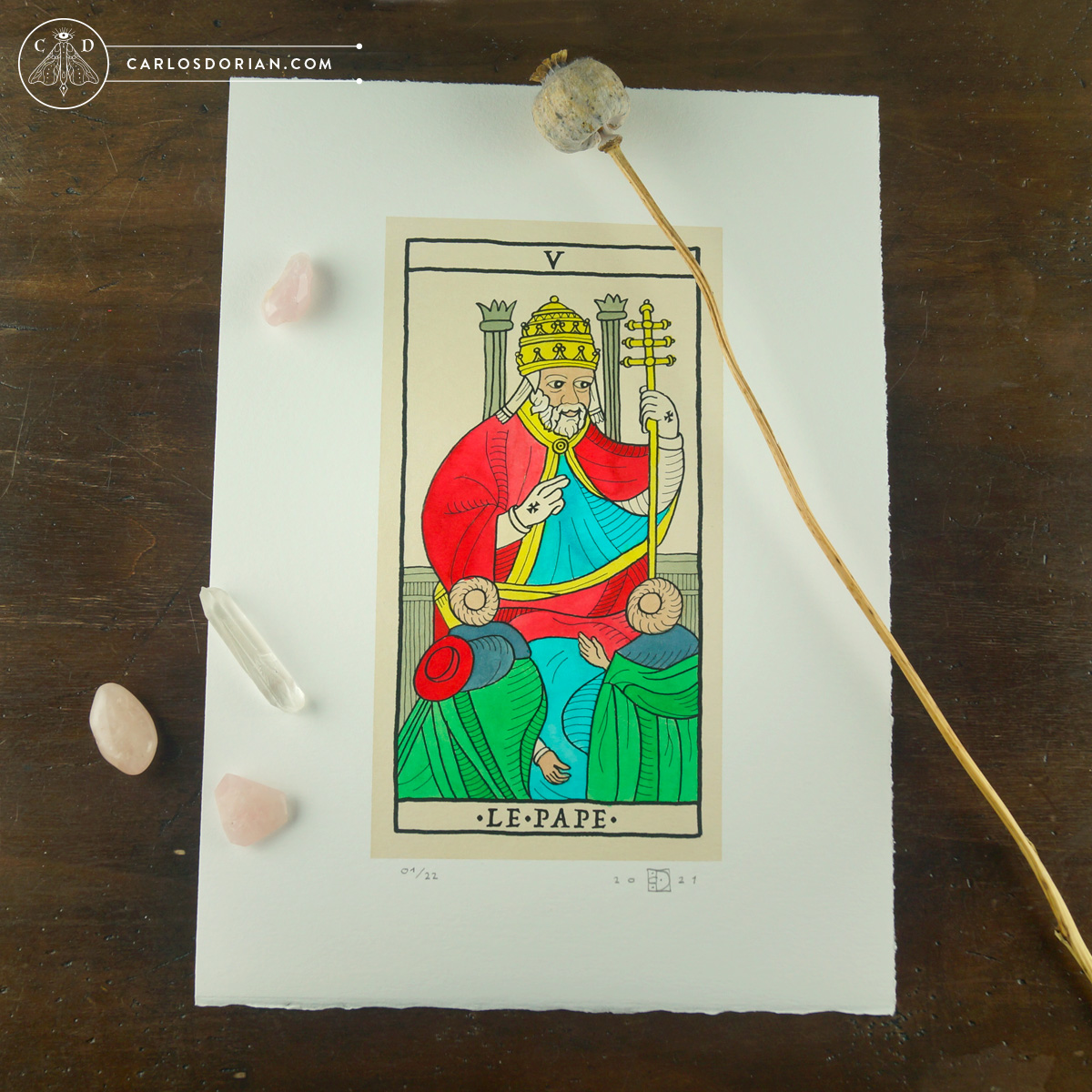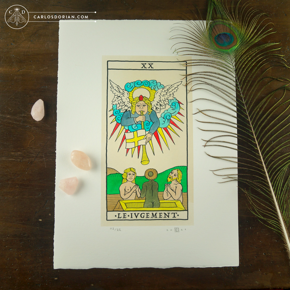 Drawings of the Major Arcana that make up the “Ludus Triumphorum” deck. These Tarot Watercolor sheets are printed in black ink on high quality cotton paper and hand colored one by one.