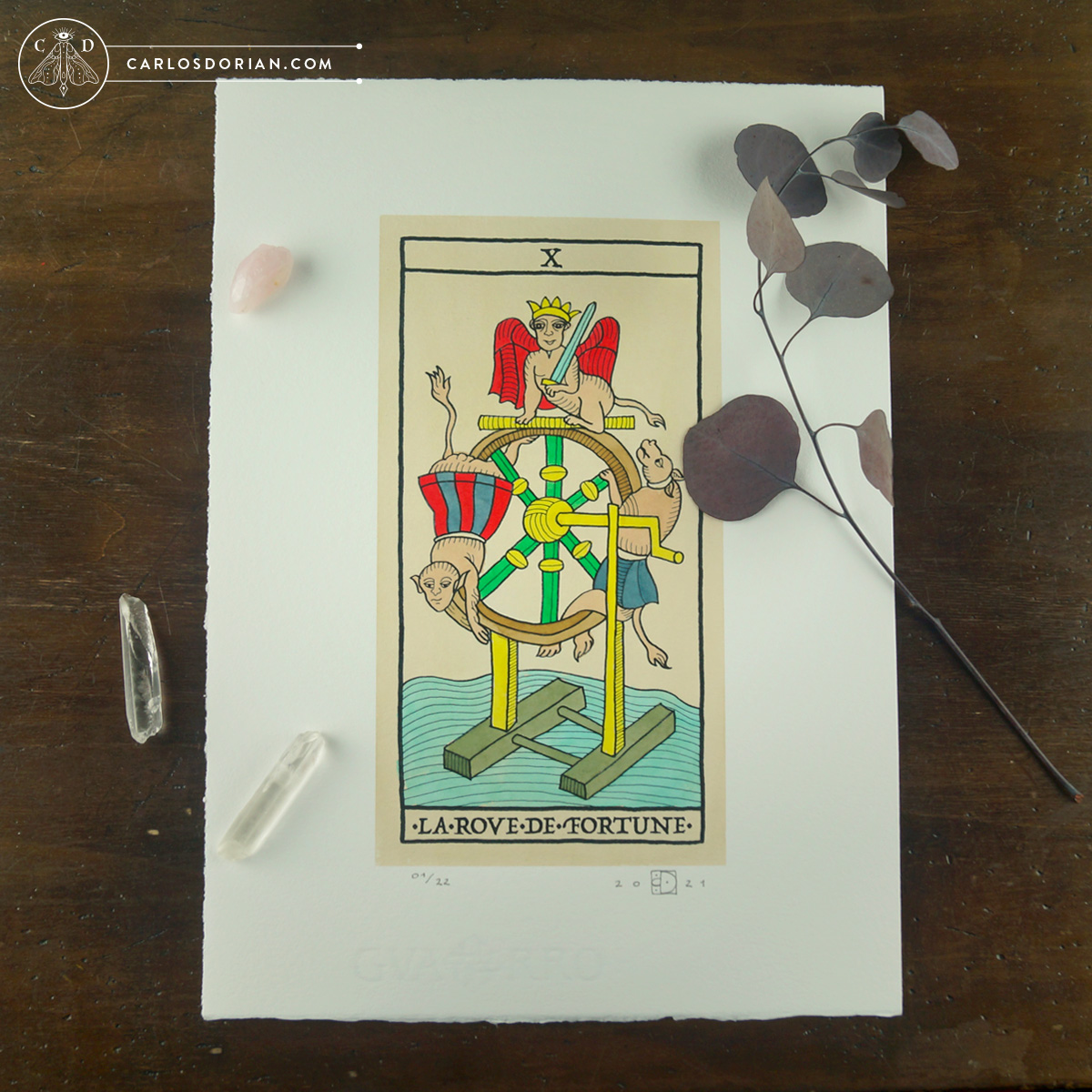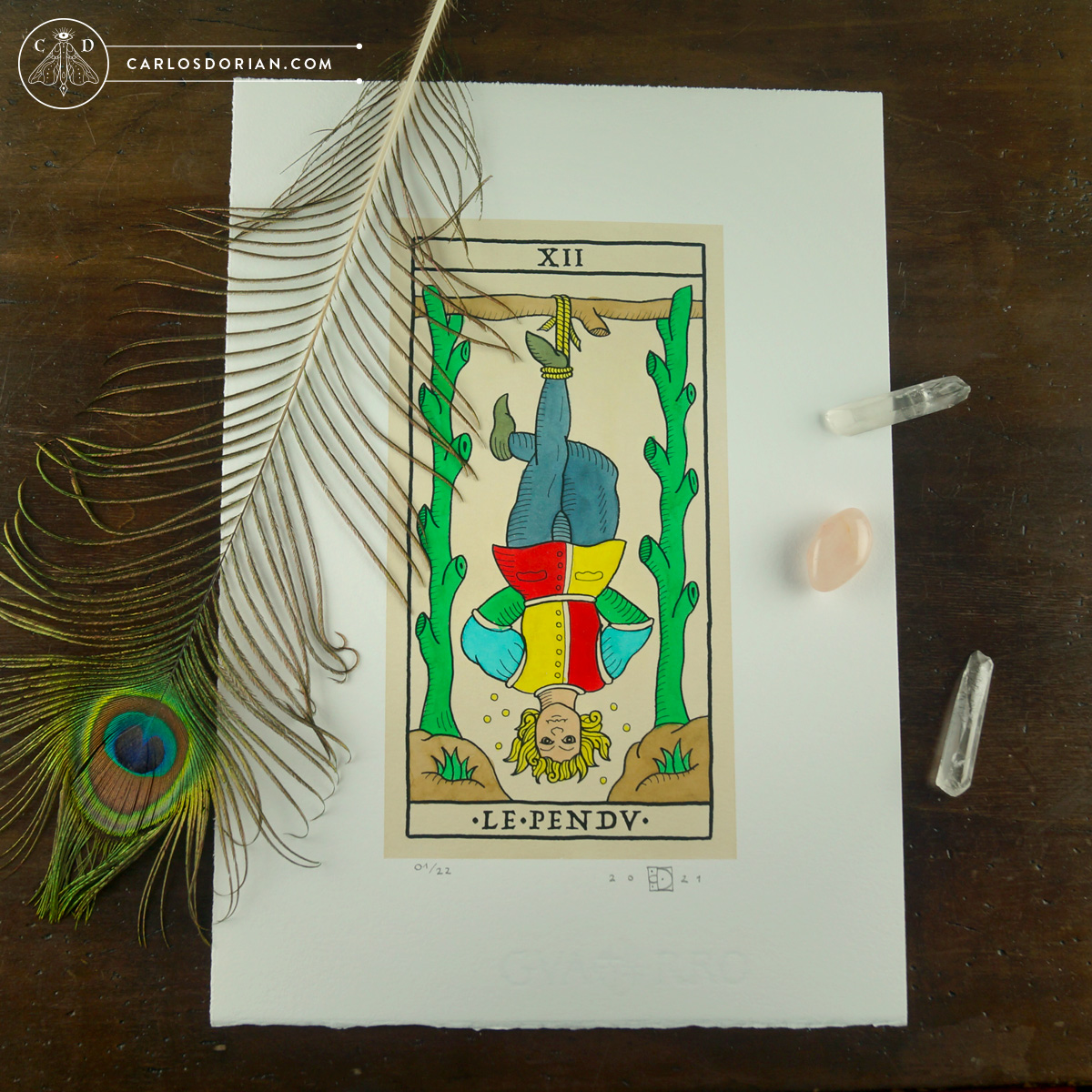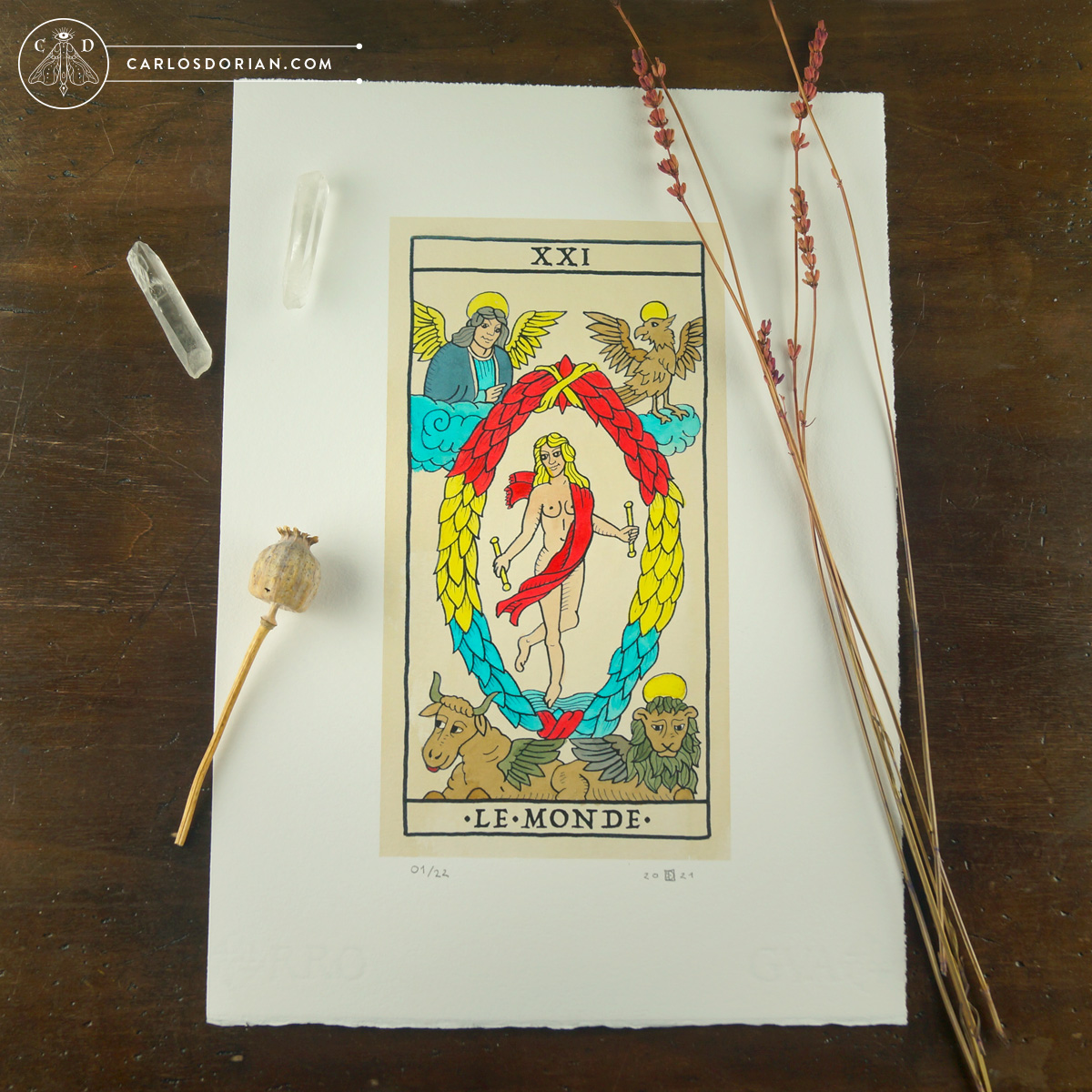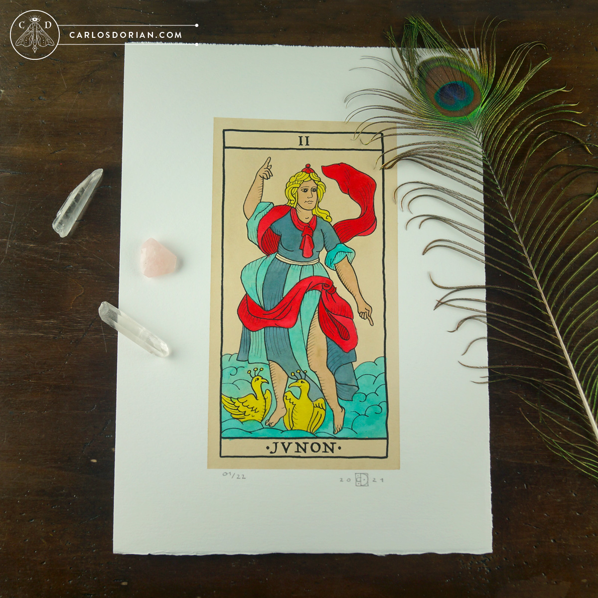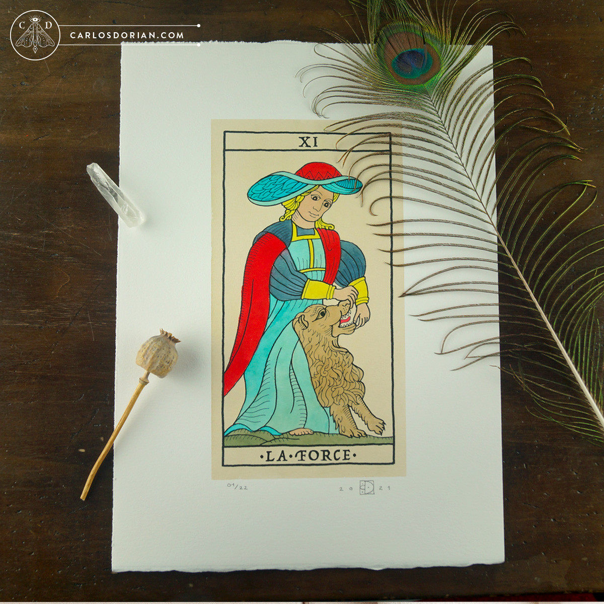 Drawings of the Major Arcana that make up the “Ludus Triumphorum” deck. These Tarot Watercolor sheets are printed in black ink on high quality cotton paper and hand colored one by one.