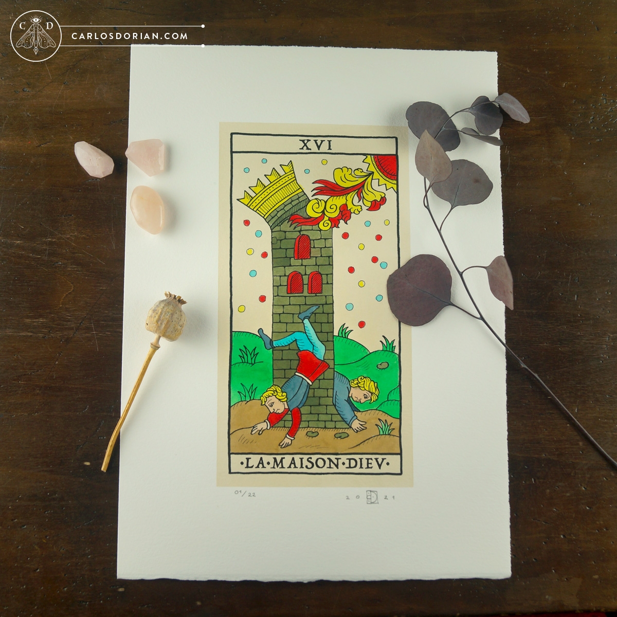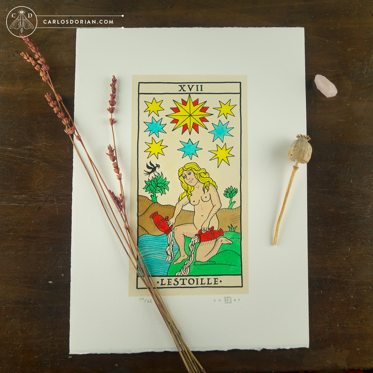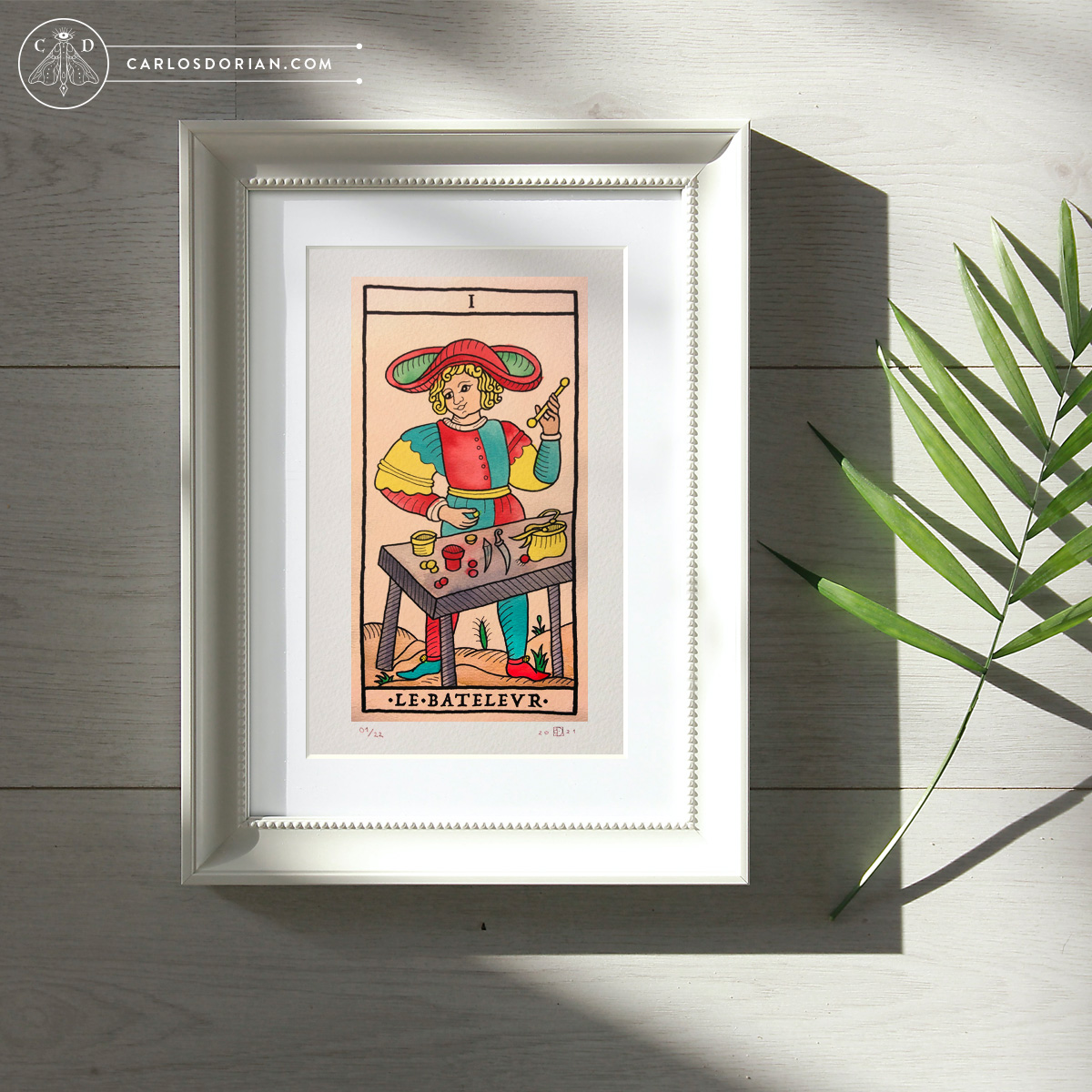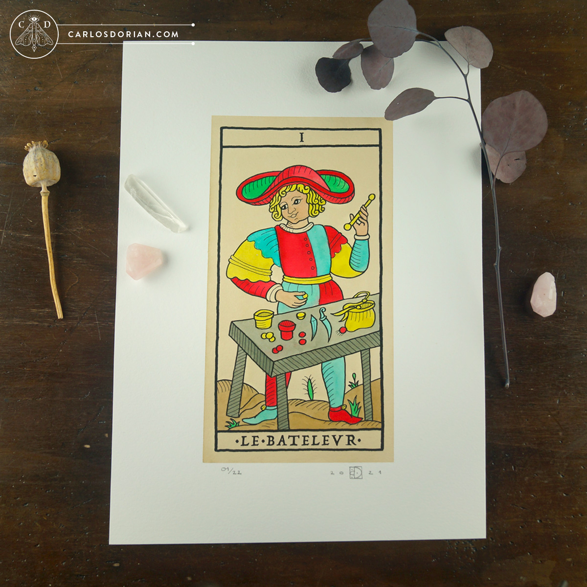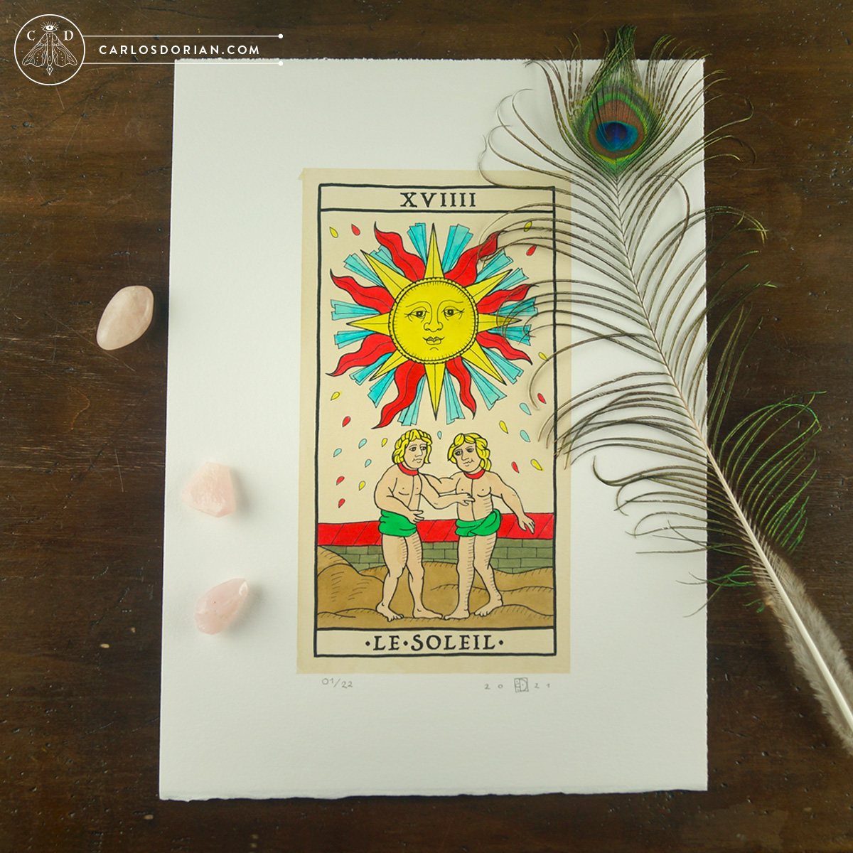 Drawings of the Major Arcana that make up the “Ludus Triumphorum” deck. These Tarot Watercolor sheets are printed in black ink on high quality cotton paper and hand colored one by one.