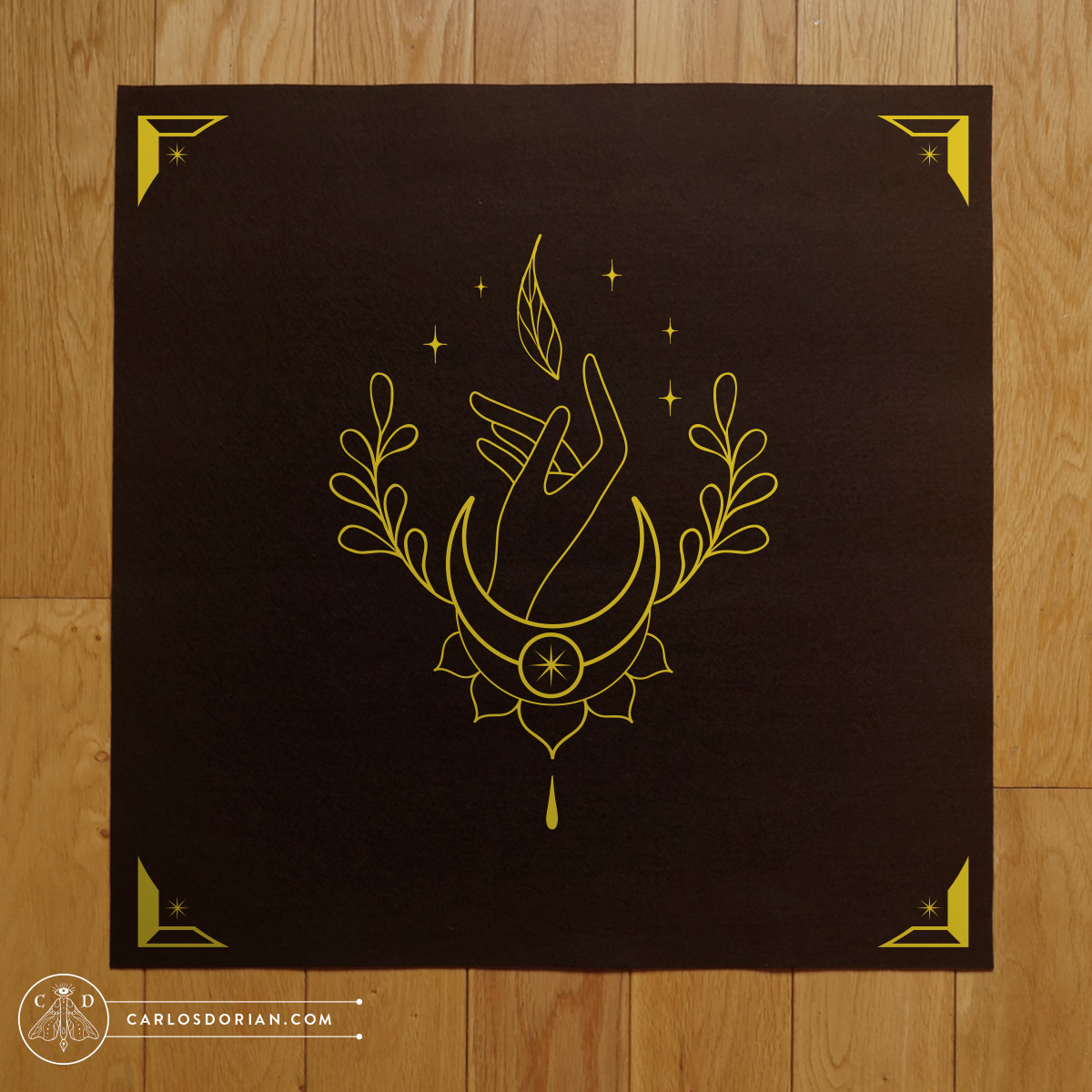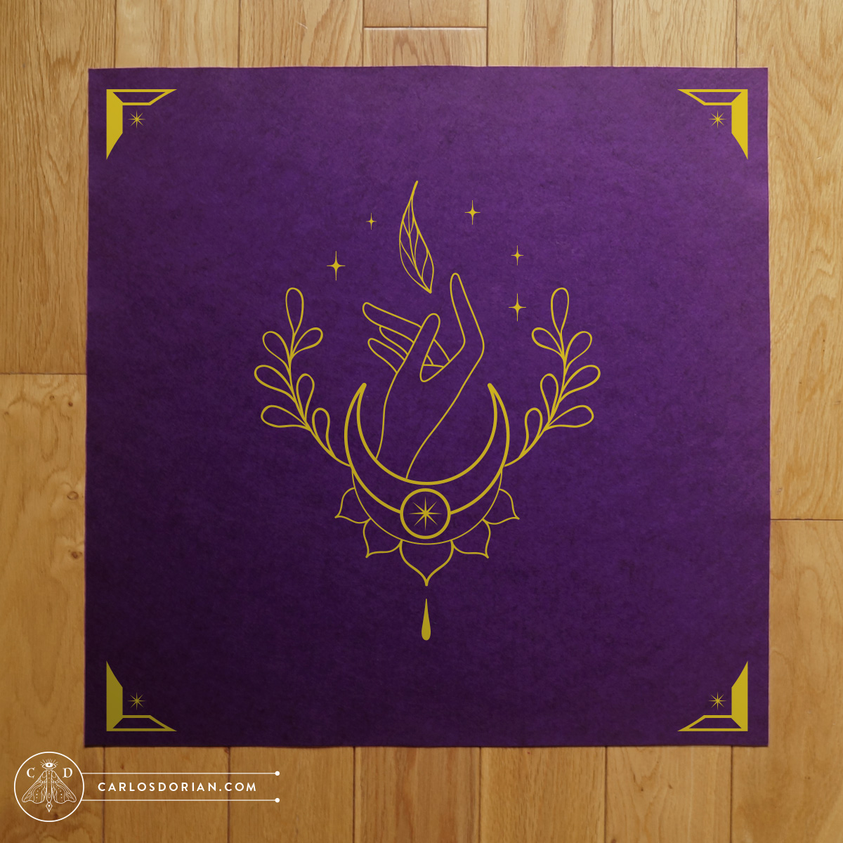 Features: The tablecloth is printed in Gold on high quality minimalistic plain Felt, you can choose between two colors for Felt: Black or Purple. This Felt is made of the highest quality with a thickness of 1mm, its measures are 50x50cm. Additionally, I can personalize the tablecloth with your initial or zodiac sign