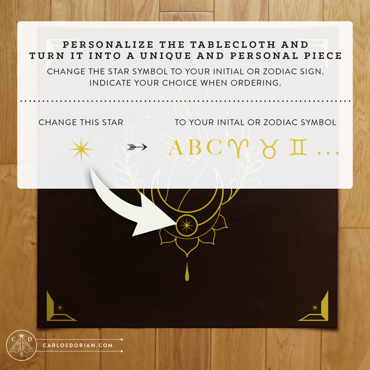 Additionally, I can personalize the tablecloth with your initial or zodiac sign, so that you have a completely unique piece with your own energy. I can replace the “Star” on the design with your initial letter or astrologic sign (check the picture to see additional info about the placing of these signs).