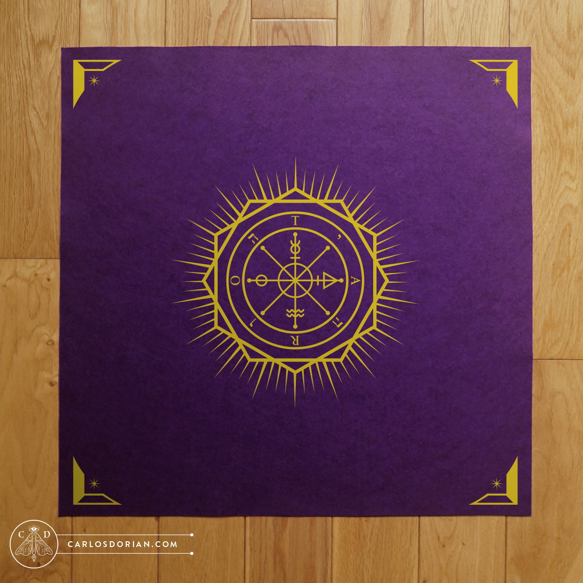Features: The tablecloth is printed in Gold on high quality minimalistic plain Felt, you can choose between two colors for Felt: Black or Purple. This Felt is made of the highest quality with a thickness of 1mm, its measures are 50x50cm.